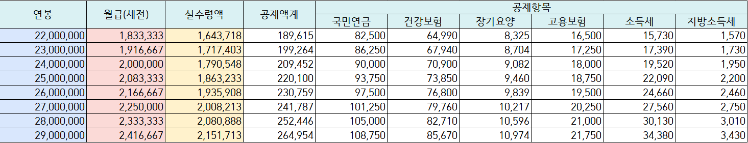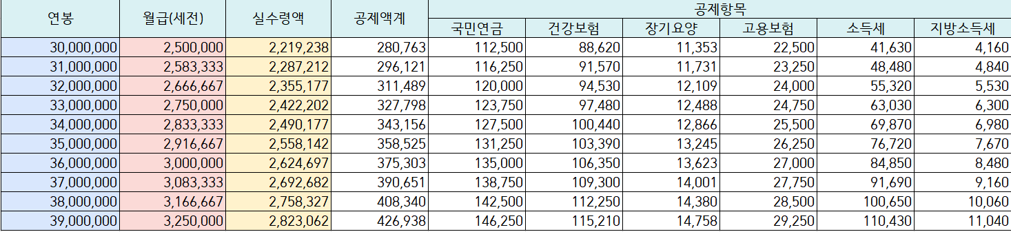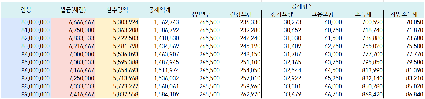 연봉과 실수령액은 다릅니다. 연봉은 세전 금액으로, 회사가 약속한 총 보수액입니다. 반면 실수령액은 세금, 보험료, 기타 공제액을 제외한 실제 지급 금액입니다. 공제 항목으로 연봉 2000만원 8000만원까지 정리한 표입니다. 참고만 해주세요.