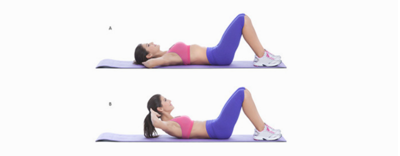 누워서 다리를 모으고 무릎을 90도로 구부리고, 손은 머리 뒤로 보내 깍지를 껴줍니다. 그리고 상체를 들어 올리는데 여기서 어깨가 땅에서 떨어질 때까지 들어야 합니다.