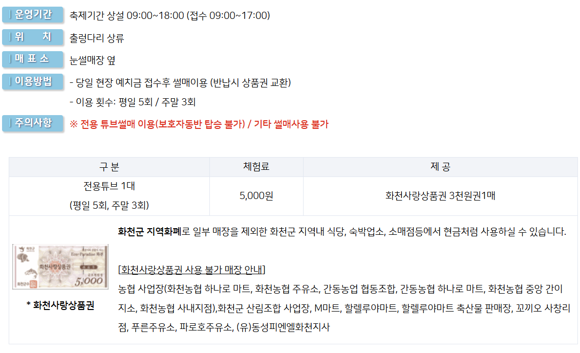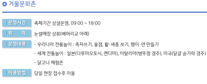 - 주요 테마: 산천어 낚시, 얼음 놀이, 전통 체험