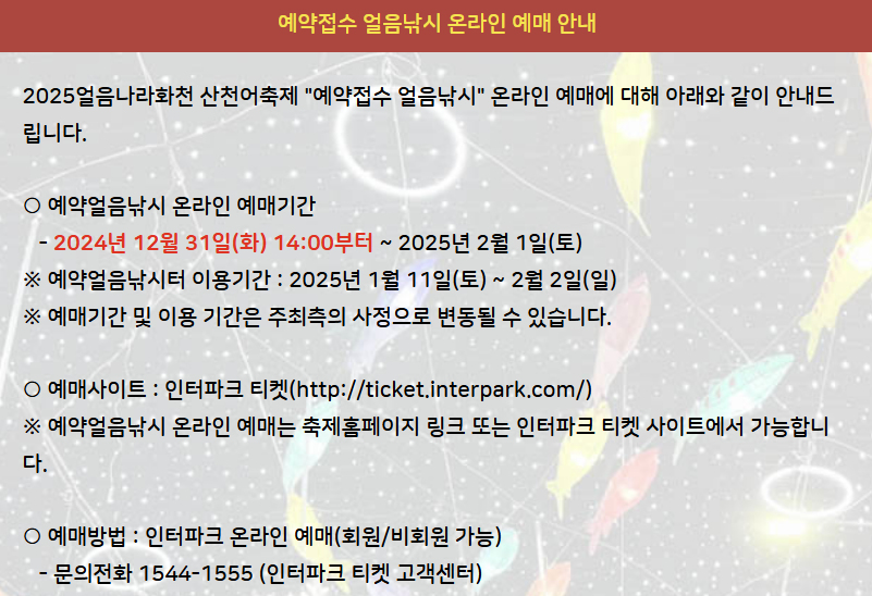 - 사전 예약하기: 산천어 낚시와 체험 프로그램은 예약제로 운영되니 미리 예약을 완료하세요.